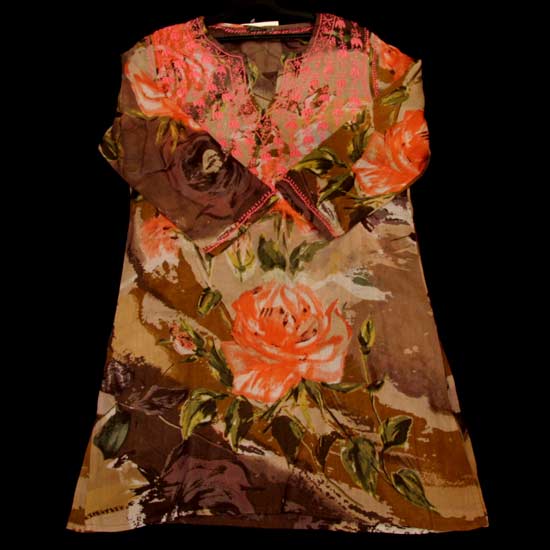 The ladies' one-piece dress bestows a stylish spilt neckline. The allover rose patterns provide an oriental style. The loose-fit design suits different body types.
