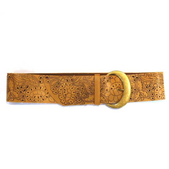 The ladies' belt is completed in brown. The ethnic floral patterns match perfectly with the golden buckle for adding an exotic touch. Show your personal style with this ladies' belt.