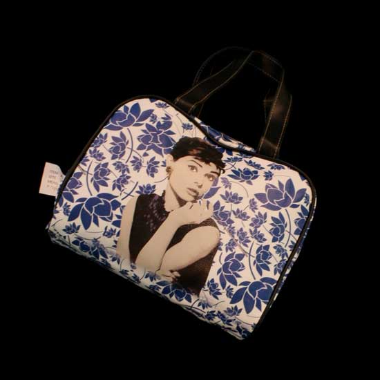 This stylish handbag is printed with an elegant picture of Audrey Hepburn and blue flower motifs. The handbag is finely crafted of supple PU leather with exquisite details. The tasteful handbag will surely bring out the distinctive temper of the wearer.