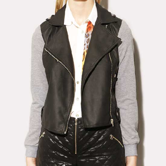 This ladies' PU jacket comes with a black body and gray sleeves for a unique look. It is designed with a big notch collar and golden zips for added style. This cool jacket is easy to mix and match with various kinds of casual wear.