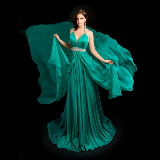 This is a ladies’ pageant dress that comes in allover green for a vibrant look. It is well crafted with refined details. This classic dress is finished with two shoulder straps, a low heart neckline and a pleated skirt.