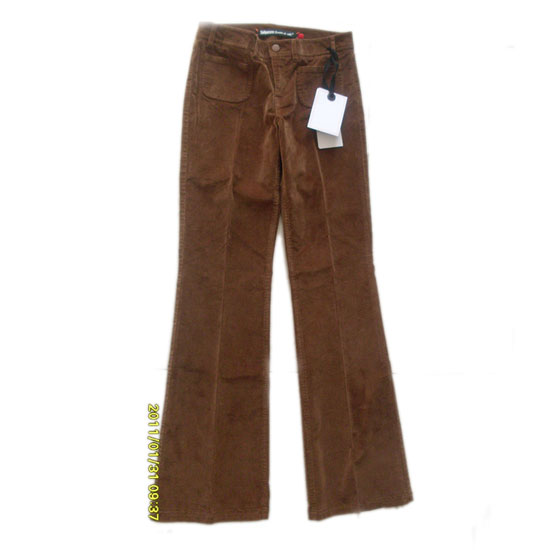 Displayed here is a pair of ladies' casual pants in a solid brown color. The pants feature a classy five-pocket, high-waist design for a flattering look. The wide leg cut adds a modern touch to these fashionable pants.