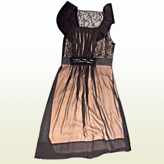 The sleeveless party dress will feminize and flatter your look in your next special occasion. The lace upper is accented with pin-tucked detailing on the chest. It complements the mesh bottom, revealing the contrasting lining in a seductive way.