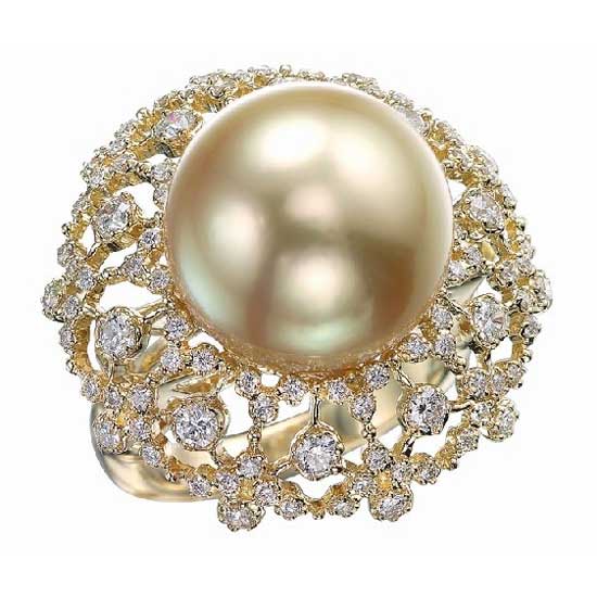 This stunning ring features a remarkably large pearl with a lustrous and shimmering surface quality. The round pearl sits proudly atop a hollow plate embedded with dazzling precious stones, giving rise to a glamorous flower figure. Crown the glory around your finger with this extravagant pearl ring.