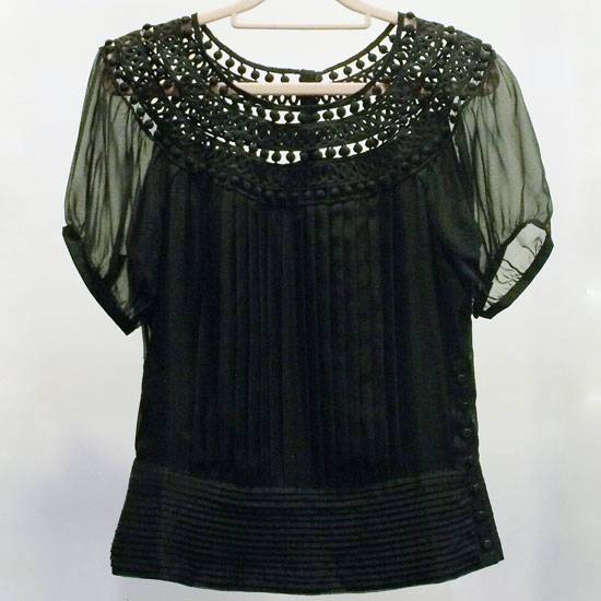 The elegant short-sleeve blouse comes with a round neckline with very delicate crocheted details. The pleated bodice and bottom hem with decorative studs on the side allow for a flattering look. The see-through gathered-cuff sleeves add an additional vogue. Finely tailored with an exquisite fabric, it promises gratifying comfort for wearing.