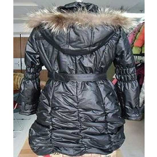 This ladies’ polyester coat flaunts a gray shell with a shimmering finish, evoking a sense of vogue. The stylish coat comes with a hood lined with fur at the edge. The outerwear is finished with a strap at the waistline to show off feminine figures.