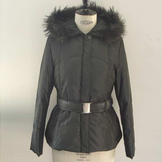 The ladies' polyester down jacket bestows raccoon fur trim for a perfect blend of warmth and style. The concealed front closure with the chic belted waist offers added style. Stay warm and look cool in this down jacket.