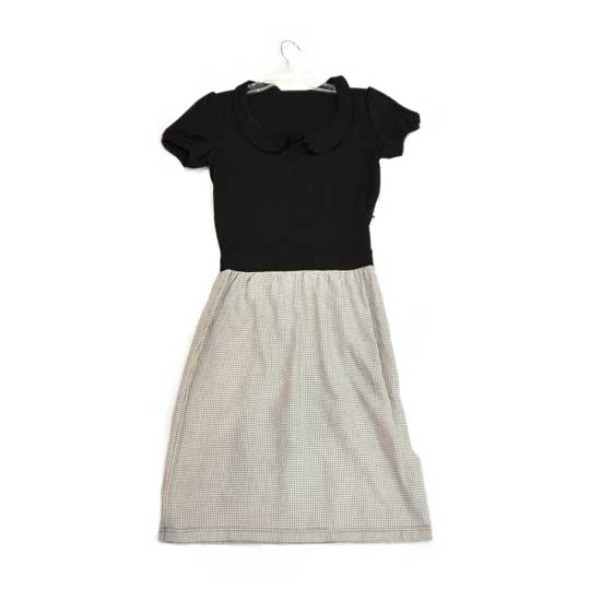 This ladies’ one-piece dress features a black bodice with short sleeves and a Peter Pan collar. The long skirt comes with plaid patterns in light colors to look smart on the wearer. This cozy dress is an ideal choice for modern ladies.