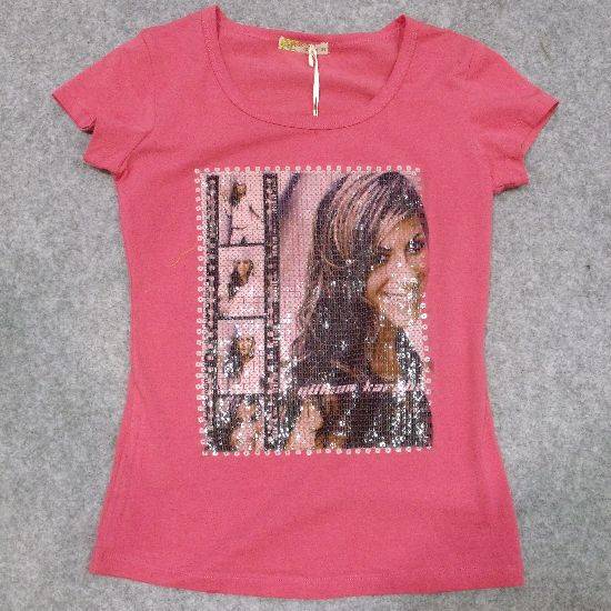 This adorable T-shirt features a round neckline and short sleeves. The front is printed with a charming European girl and adorned with sparkling sequins. The slim cutting is perfect for showcasing an alluring female figure. It is soft and comfortable to wear in the hot summer.