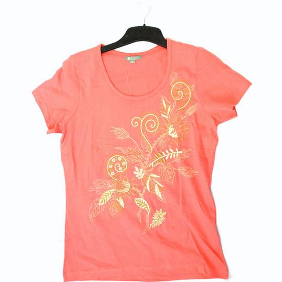 This ladies' printed T-shirt showcases a lustrous print in golden color. It features patterns of flowers and leaves, associated by golden outlines. The short-sleeve and round-neck T-shirt adds a dash of nature to ladies' outfits.