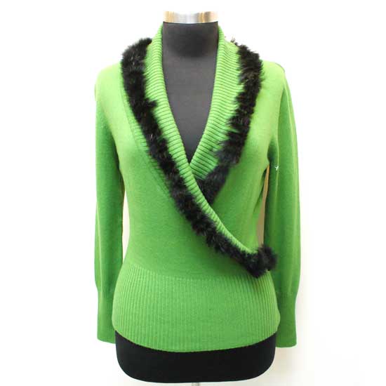 This ladies’ pullover features a folded neck with ribbed edges. Black fur trimmings are adorned on the sharp green pullover to make a sharp contrast. The soft and smooth texture makes this pullover a comfy choice for winter.