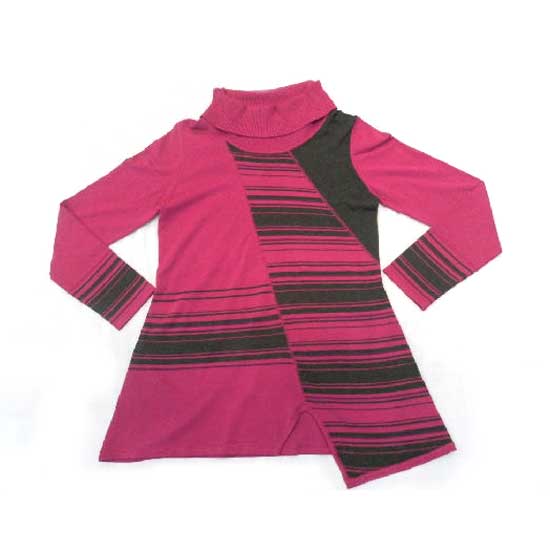 This ladies’ pullover comes in captivating fuchsia with attractive striped patterns. It is designed with a turtle neck and long sleeves. The fashionable A-cut pullover is finished with an asymmetrical hem with a little vent.