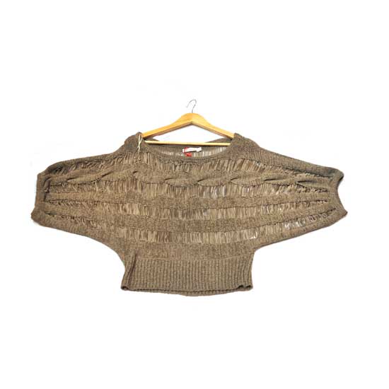 This ladies' pullover spotlights bat wing sleeves. The cropped pullover can be paired with dresses, pants, etc. The ribbed hem completes the design of this piece.