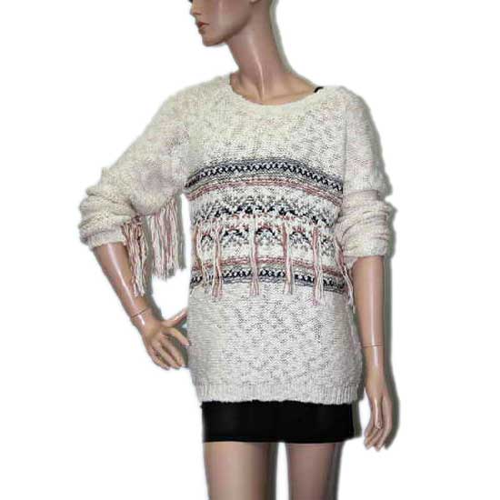 This ladies' pullover sweater comes with a classic round collar and long sleeves. Unique colorful patterns with matching fringes on the front showcase a decorative touch. This stylish pullover will give a soft and stretchy fit to you.
