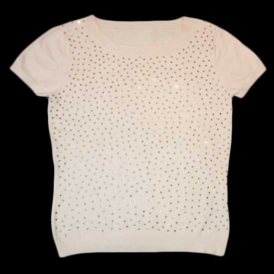 This beautiful ladies' pullover is bejeweled with sparkling beads in the front. Featuring short sleeves and a round neckline, this knitted sweater is comfortable and easy to wear. This ladies' pullover goes well with jeans, pants, leggings and many other clothes.