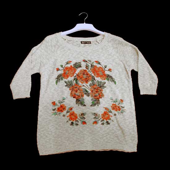 This ladies’ pullover comes with a round neckline and middle-length sleeves. It is fully accented with multi-colored rose patterns for a decorative touch. This attractive pullover is made of 45% cotton and 55% acrylic to ensure wearing comfort.