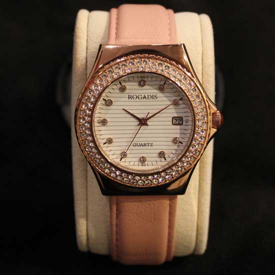 The ladies' quartz analog watch is styled with a stone set bezel to showcase shimmering appeal. The dial is embellished with jewel hour markers for added style. Keep yourself on time with this elegant stone set quartz analog watch.