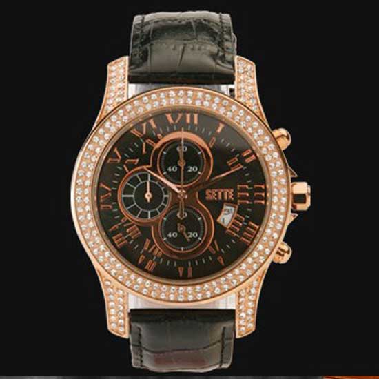 The watch here boasts a sophisticated design for modern ladies. The round stainless steel case is plated in a golden tint and embellished with dazzling shiny stones. The dial is designed in black to concert with the black genuine leather strap.