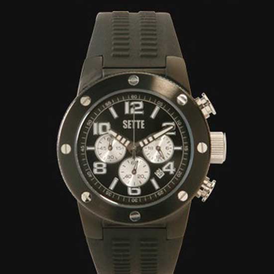 This quartz analog watch looks exceptionally fashionable with its all-black appearance. The stainless steel case features a brushed finish, with screws as decorations. The crowns and details on the dial are designed in silver for an added style.