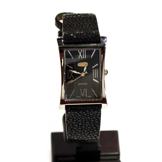 This wristwatch features a unique quadrilateral case in silver. The Roman numeral display adds a classic touch to this watch. The black stingray straps makes this watch look more dainty and instinctive.