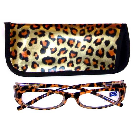Displayed here is a pair of reading glasses designed for ladies. The leopard patterns deliver a touch of wildness. The reading glasses come with a pouch for easy carrying.