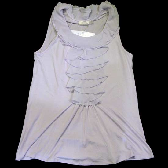 The ladies' sleeveless top features ruffle details at the front with pleats, showcasing an elegant look. It comes with big armholes for added style. Add a feminine touch to your wardrobe with this sheer ruffled top.