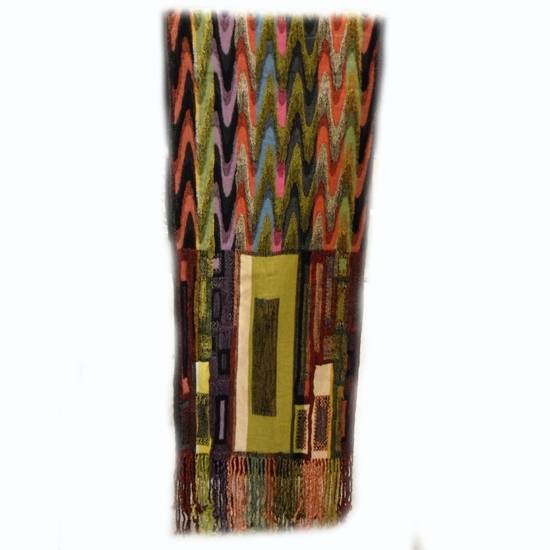 This colorful scarf featuring wavy and rectangular patterns is definitely eye-catching. The fringes add detail to the design. It is an ideal piece to wrap around the neck and keep you warm in winter.