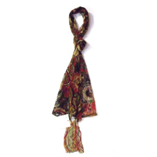 The ladies' scarf is made of nylon to give a soft texture. The abstract patterns and trim at the bottom add a touch of style. Wear this scarf to complement any plain outfits.