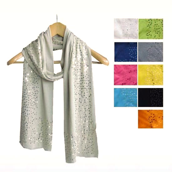 Featured is a regular scarf without ruffles or fringes. What draws eyes is the sparkling addition of sequins all-over the scarf. It can be worn in various ways to match your daily mood.