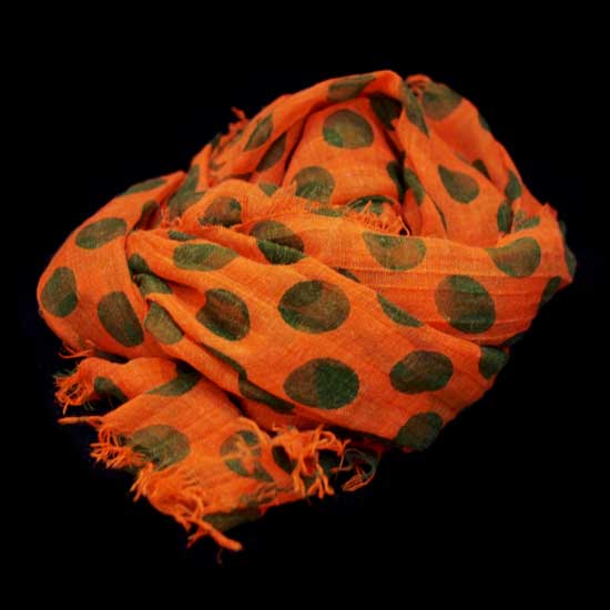 This orange-colored scarf is accented with black dot patterns. The top-quality scarf is finely made of 80% polyester, 10% nylon and 10% wool. The tassel trimming completes the design of this piece.