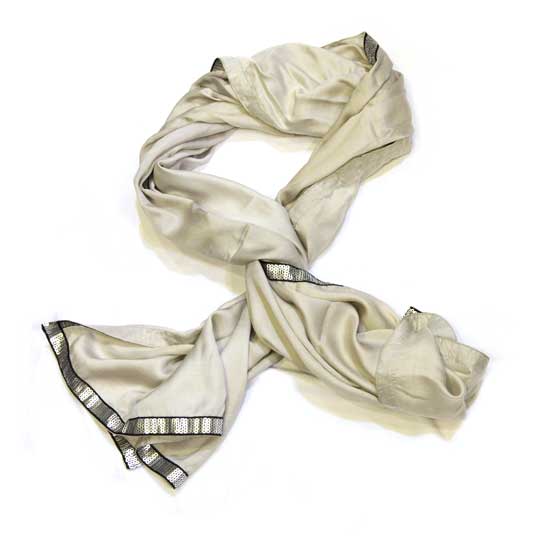 This ladies’ dyed scarf comes in light gray with a shiny finish. The edges are crafted with glittering silvery sequins for extra glamor. Made of 100% modal satin, this fashionable scarf promises optimum wearing comfort.