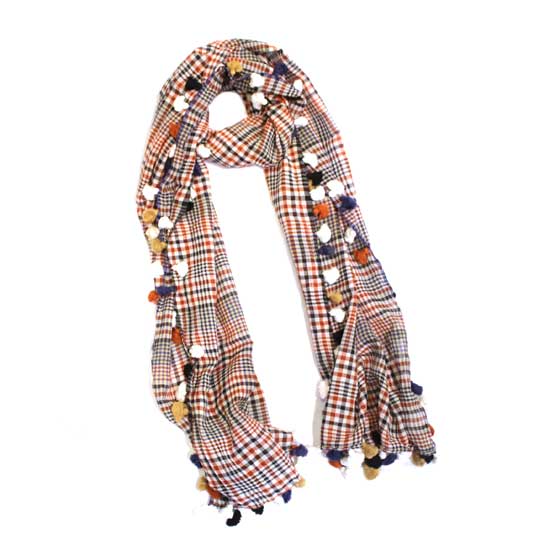 This ladies’ scarf features allover plaid patterns for a stylish look. The brilliantly colored small decorations at the edge bring a vivid touch to the design. This fascinating scarf is made of pure cotton to ensure coziness.