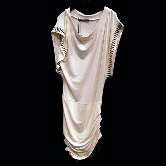 This garment here is an elegant dress that features a scoop neck. The dress is adorned with acrylic decorations on the sleeves. It is an excellent dress that will go well with other garments.