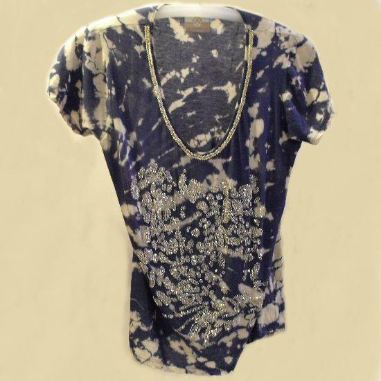 This stylish blouse comes with a U-neckline and short sleeves. It boasts an all-over tie-dye styling in blue and white. It features a dazzling leopard-face print on the front. The sparkling trimming on the neckline showcases a touch of uniqueness.