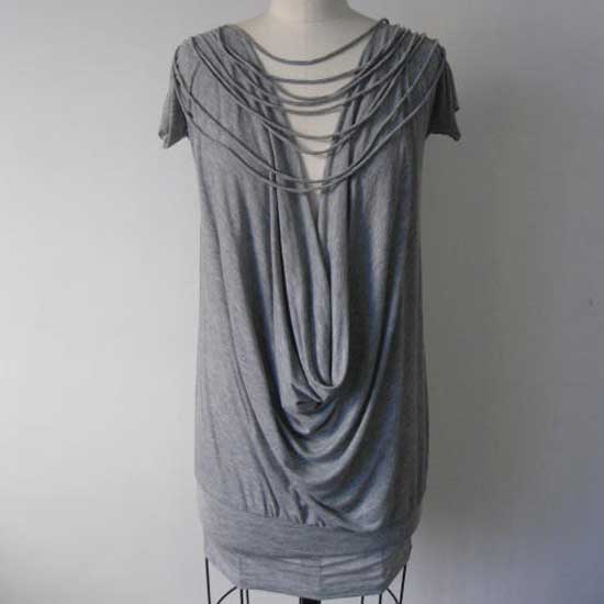 As shown is a thigh-length dress designed with short sleeves. The dress features a big howl neck to match with different tops. Beaded chains are added across the chest to highlight a sense of elegance.