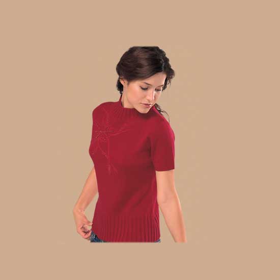 The ladies' pullover has short sleeves and a turtleneck design. It showcases floral patterns on the top right for decorative touch. This pullover has finely finished cuffs and hemline.