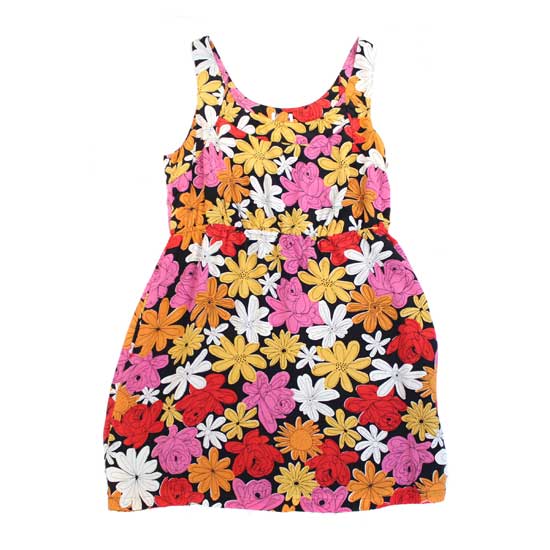 This ladies’ sleeveless dress with a round neck catches your attention with its allover flower patterns in pink, red, white and orange. It is made of silk which is ultra soft and comfortable for the summer. This vivid silk dress looks great with a sun hat.