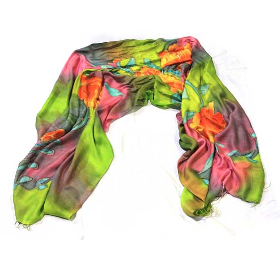 The ladies' scarf boasts hand-printed graphics in vibrant colors, showcasing an aesthetic touch. It boasts fringes for added style. Complete your look with this hand-printed silk scarf.