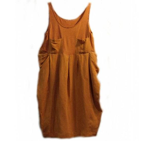 Featured is a scoop-neck sleeveless dress in a bright color. It comes with two square front pockets and pleating at the empire waistline. It is a cute fashion apparel for the hot summer.