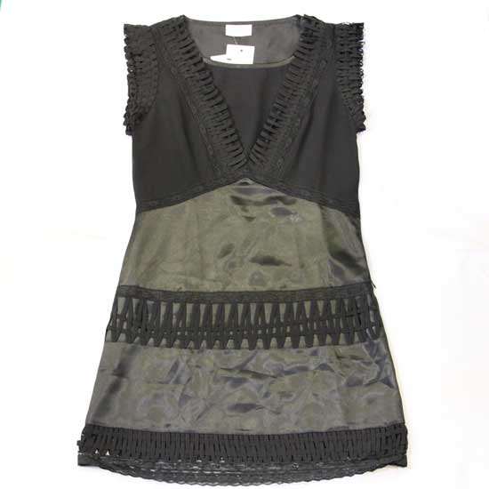 This ladies' sleeveless dress comes in elegant black and gray colors. The black top features a low round neckline for a relaxing design. The subtle woven details adorn the armholes, the chest, and the bottom.