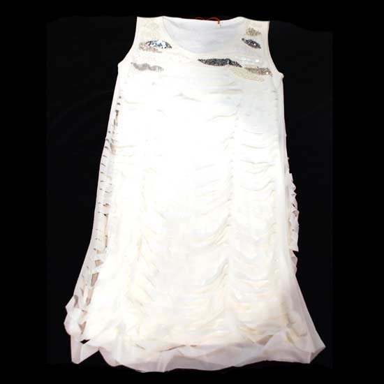The ladies' dress is sleeveless and has a round neckline. The ruched patterns and beads add a decorative touch to the design. This dress can be worn alone or with skinny pants.