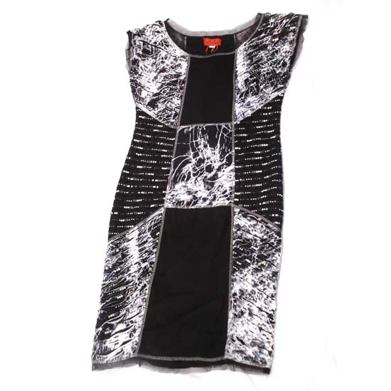 The ladies' dress features beaded and shiny patchwork patterns. The neckline, cuffs and hem showcase lace trimmings for a delicate touch. Wear this modern chic dress with heels.