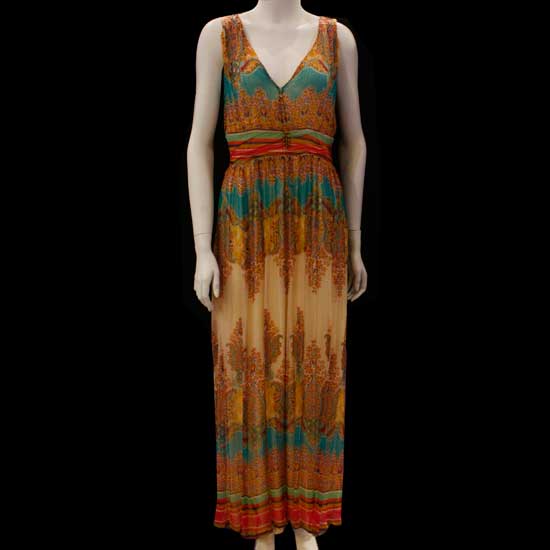 This ladies' dress flaunts a full length with a flowy skirt. Designed with elaborated, colorful patterns, this dress adds an ethnic touch to your look. Sleeveless with a deep V-neckline, this dress looks sexy and charming.