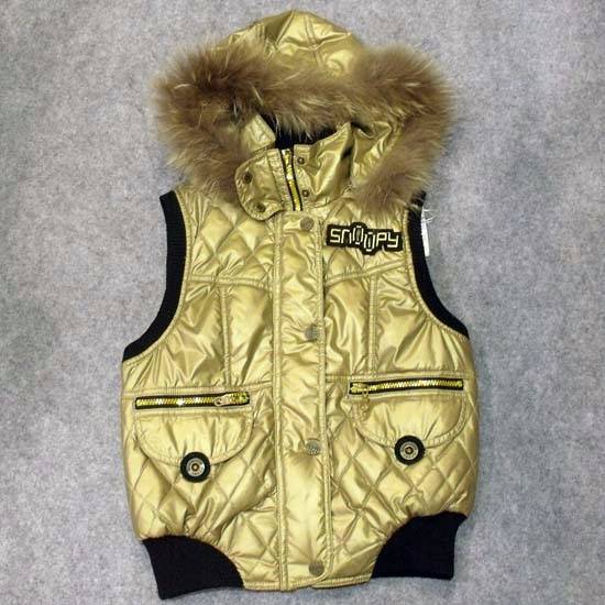 This eye-catching quilted jacket features a sleeveless styling with a hood embellished with fur. It comes with a stand-up collar and a zipper-and-button closure. The front is decorated with a pair of flag pockets with two golden zippers. The glazed surface is complemented with nice stitching. It offers great warmth and comfort for the cold winter.