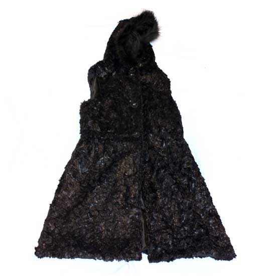 This is a ladies’ sleeveless jacket coming with a hood. The jacket boasts a flurry shell, offering a smooth and soft touch. The lustrous black jacket makes a cool choice for mix and match.
