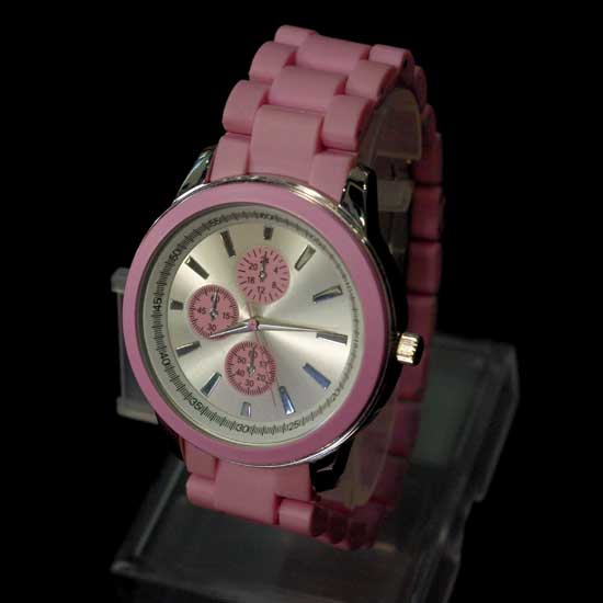 Showcased is a beautiful analog watch with a stopwatch function. The stylish rubber watchband in pink adds a girlish touch. Show off your chic styling with this delicate watch.