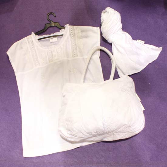 This ladies' summer fashion set comes with an angelic design in white. It includes a sleeveless blouse, a handbag and a scarf made of soft and comfortable materials. The finely made items add an elegant touch to a lady in summer.