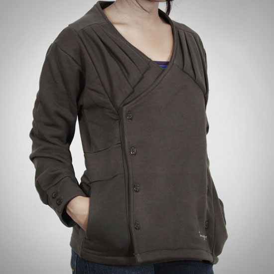 This brown ladies’ sweater flaunts a V-shaped neck and ruched details for a touch of uniqueness. The front is configured with a pair of side pockets for added functionality. The enchanting sweater is finished with an off-center button closure, sporting a sense of vogue.