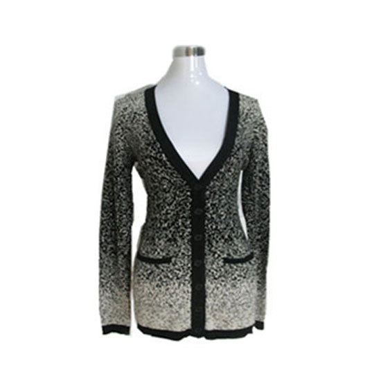 This is a V-neck ladies' sweater featuring a black/white finish. The button front closure boasts an easy-wearing construction. It is tailored with a pocket on both sides for practical use.