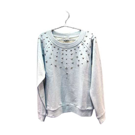 This ladies’ round-neck sweatshirt features silvery toned star and dot decorations along the neckline for a cool touch. It is made of ultra soft material for a snug fit. This gray hued fleece sweatshirt is easy to mix and match.